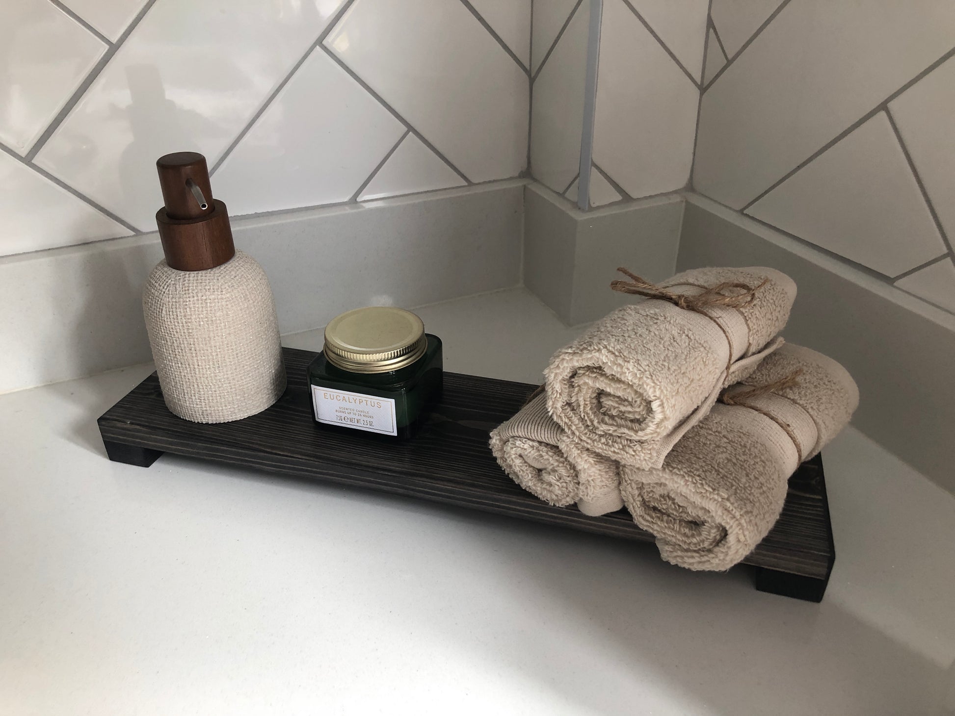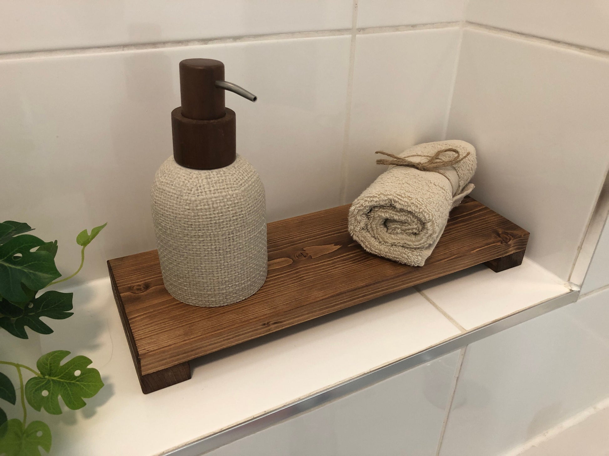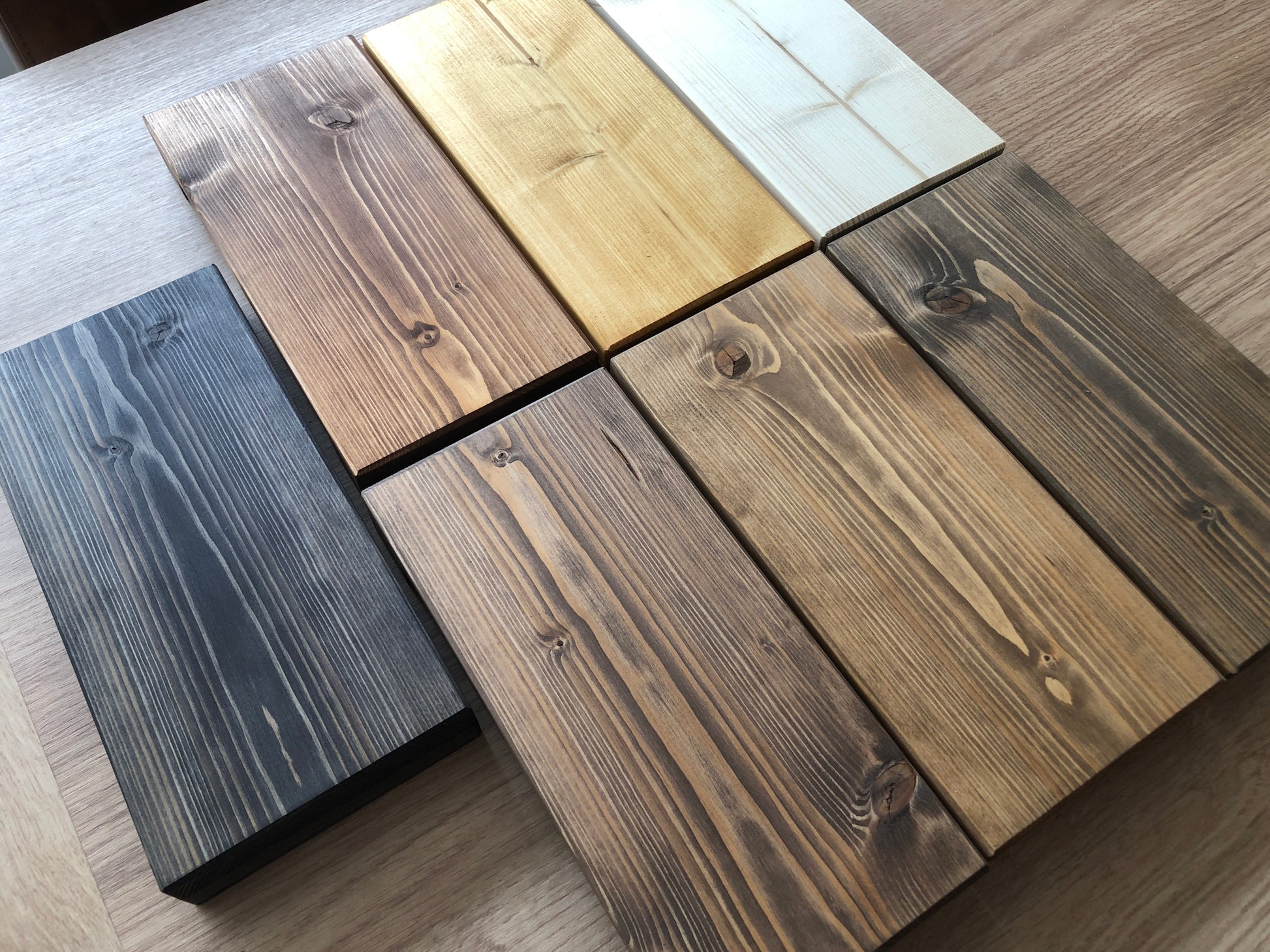 The rustic risers are made from hand picked timber and finished in a nourishing wood dye. The dye we use is a high grade wood oil. We hand stain these items, and when the grain soaks in the dye, it gives a long lasting and deep finish.